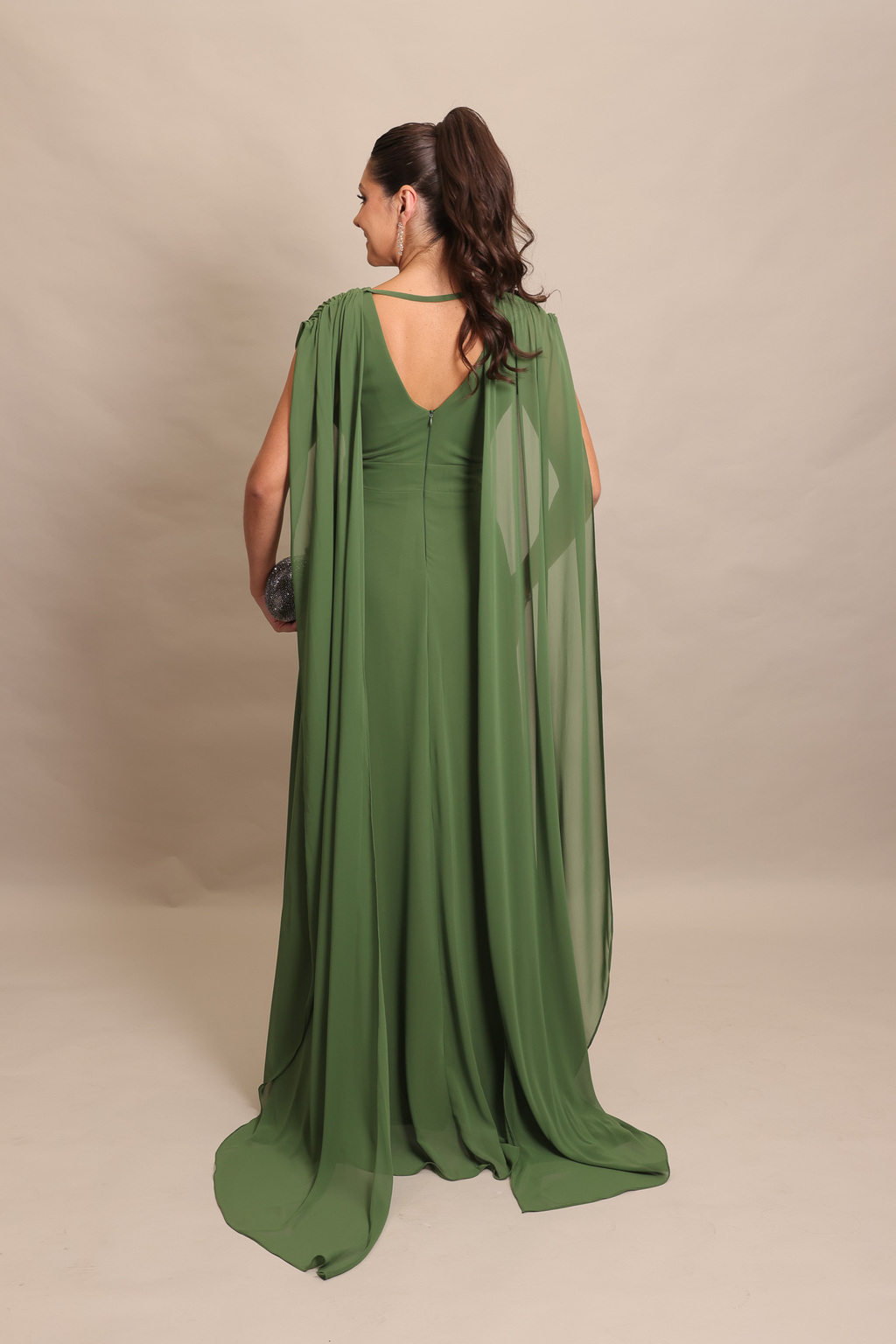 Posssui capa fixa ao Vestido e cinto com detalhe em bordado.