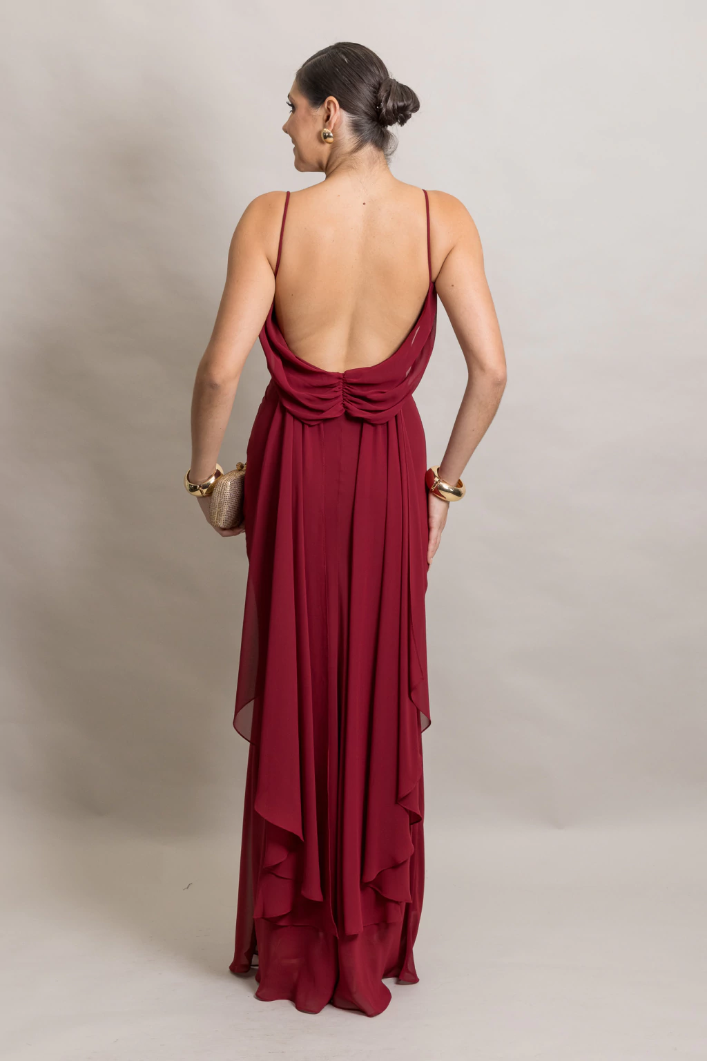 Possui costas abertas com decote profundo.