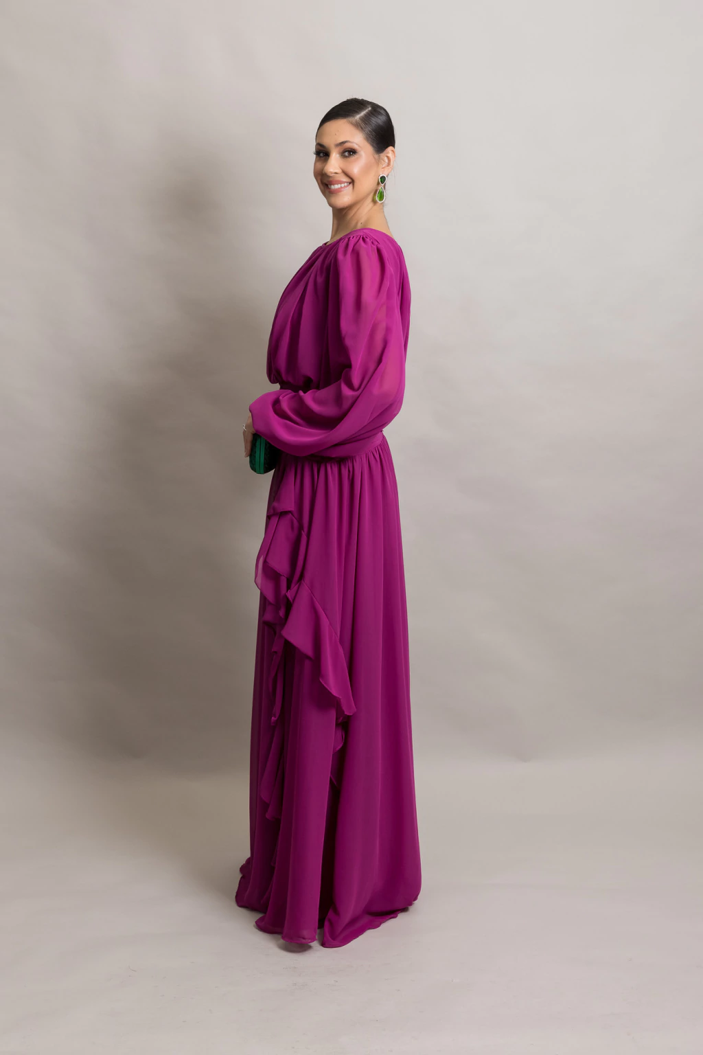 Confeccionado em Chiffon, possui leveza e fluidez com babados laterais.