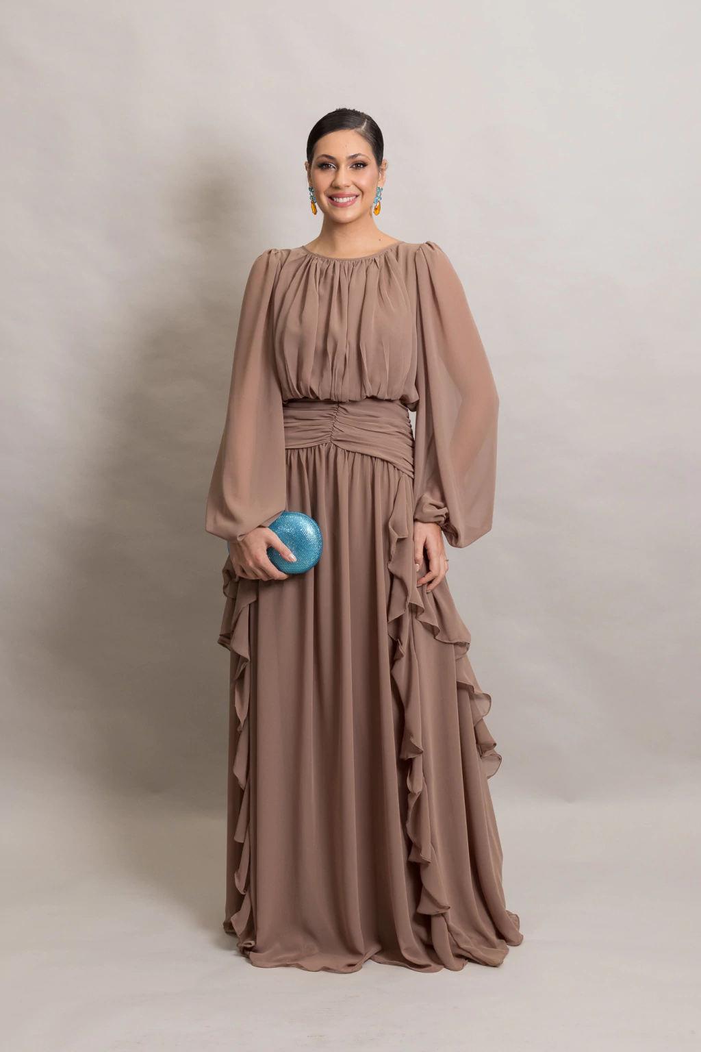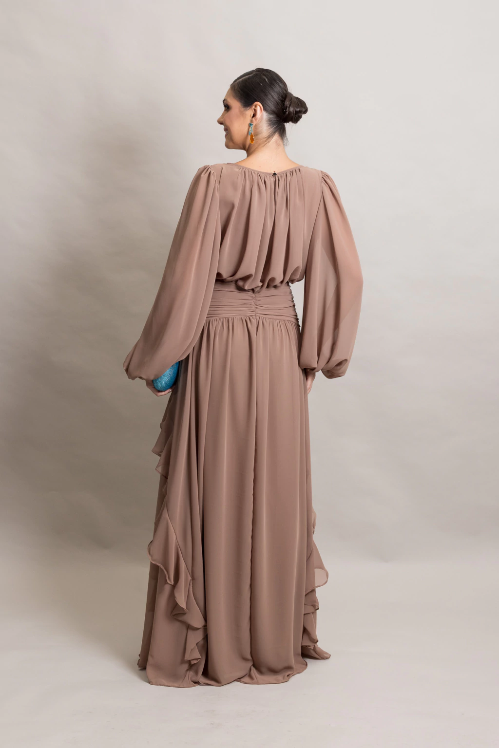 Confeccionado em Chiffon, possui leveza e fluidez com babados laterais.