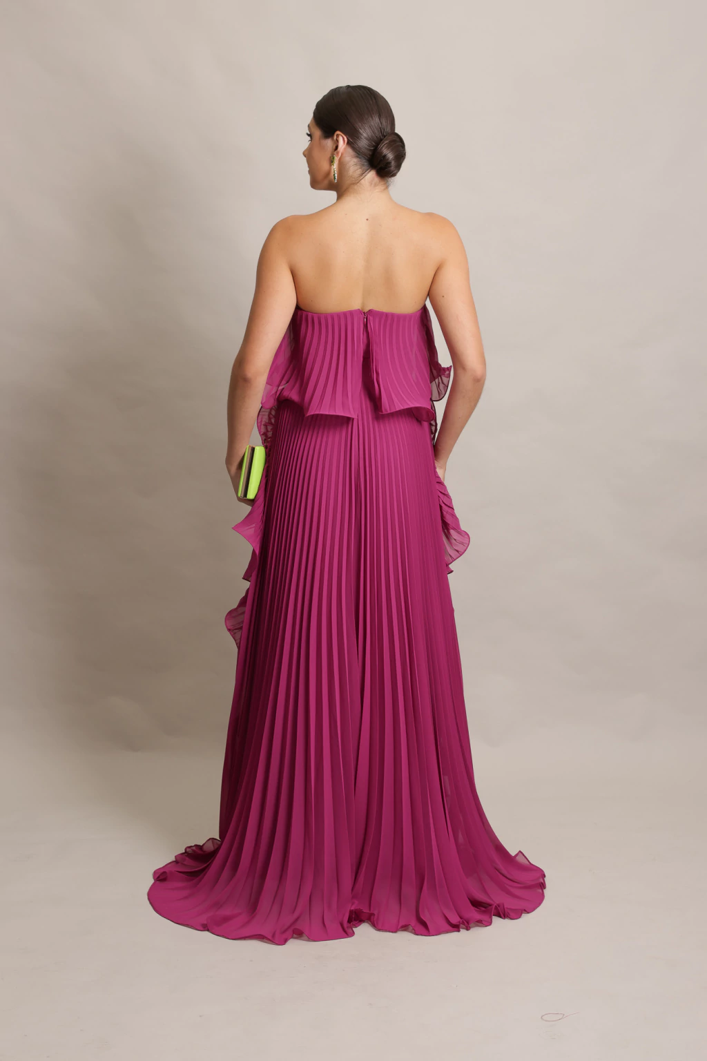 Nosso Vestido Luma possui decote tomara que caia com leve ondulação em sua barra.