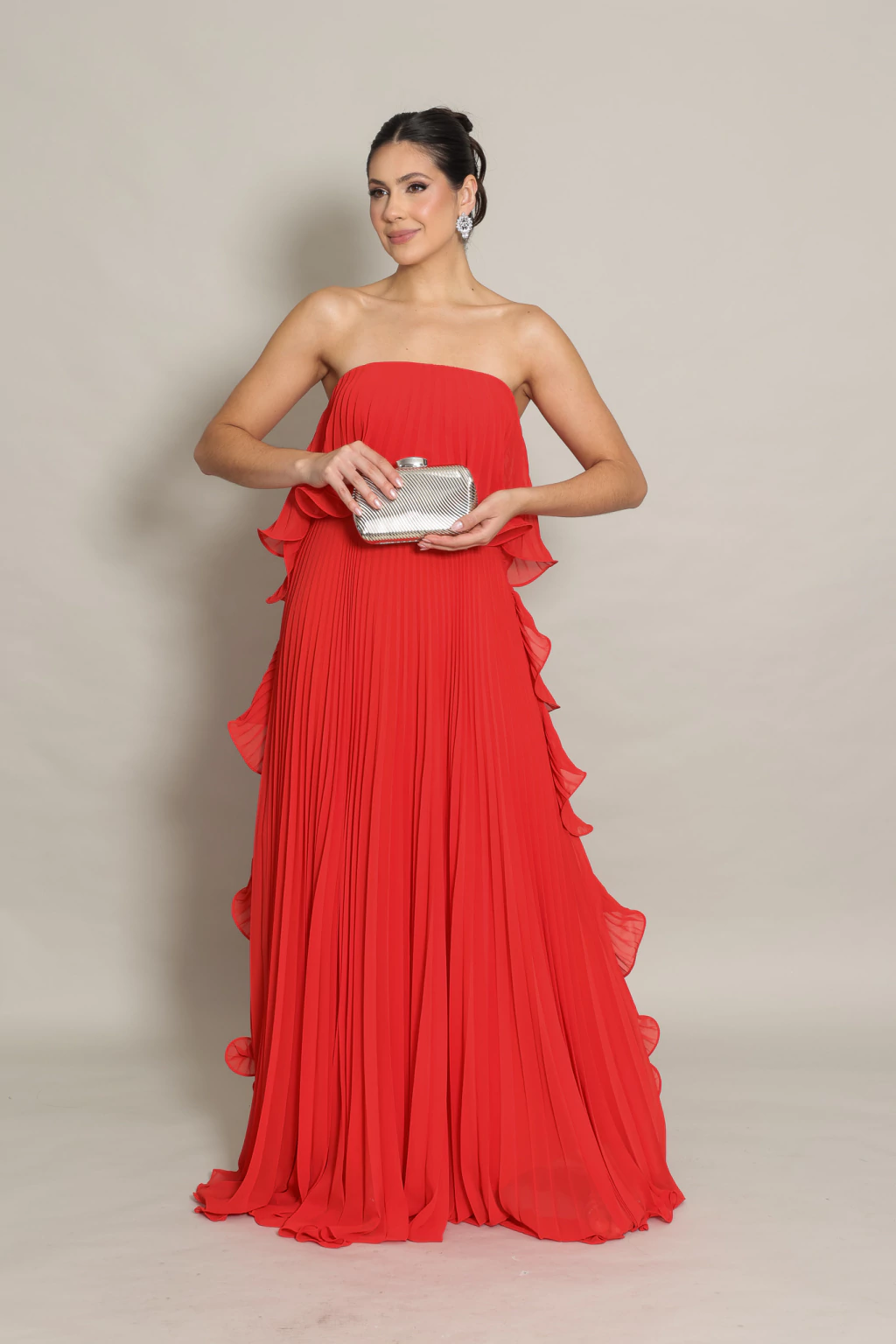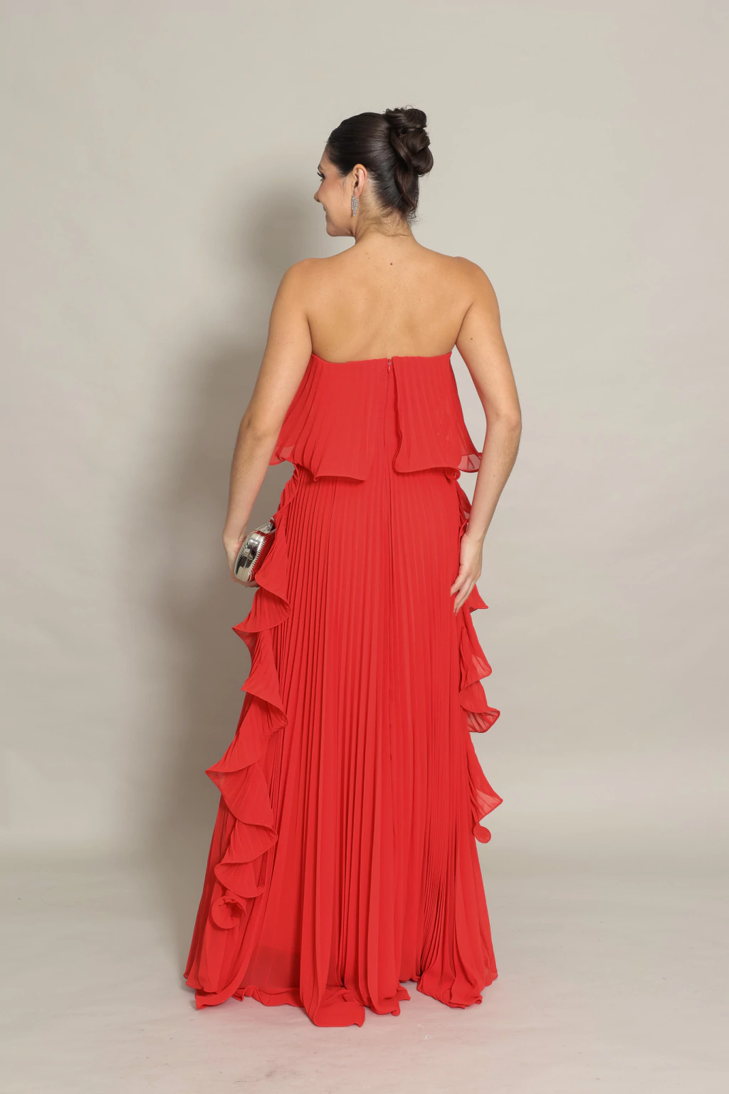 Nosso Vestido Luma possui decote tomara que caia com leve ondulação em sua barra.