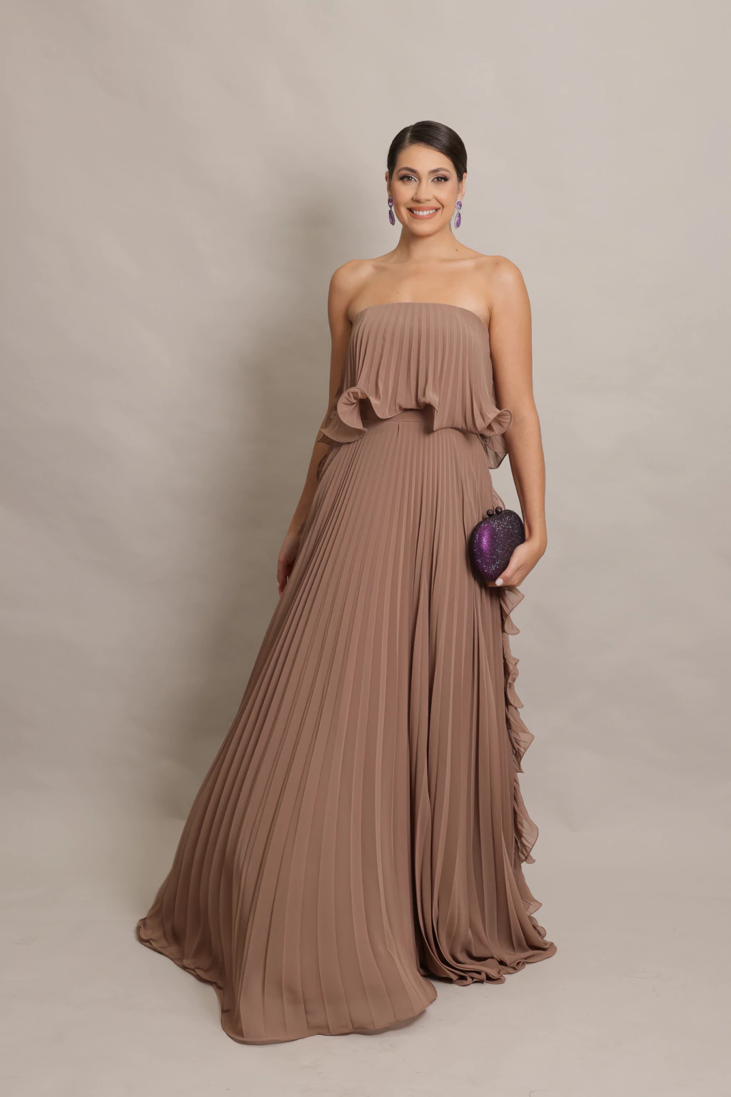 Nosso Vestido Luma possui decote tomara que caia com leve ondulação em sua barra.