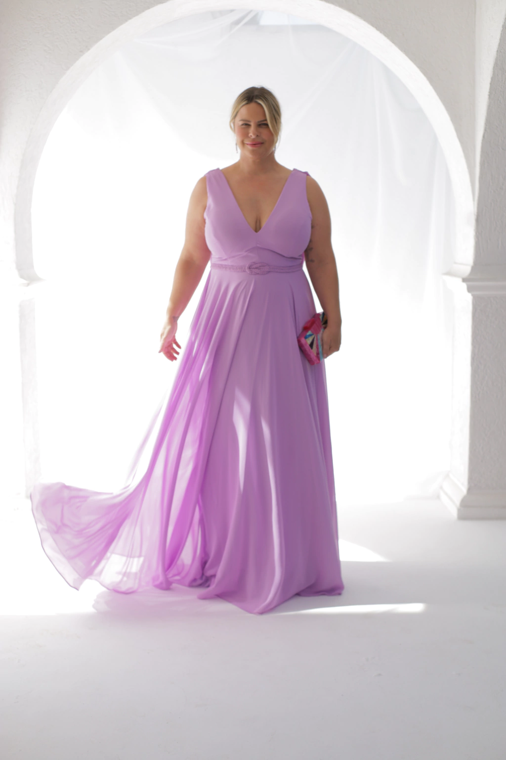 Nosso Vestido Plus Size Layla possui decote V frontal com capa presa a peça.