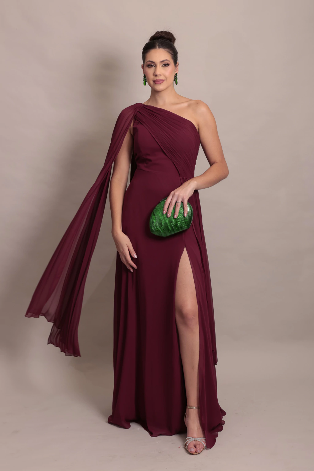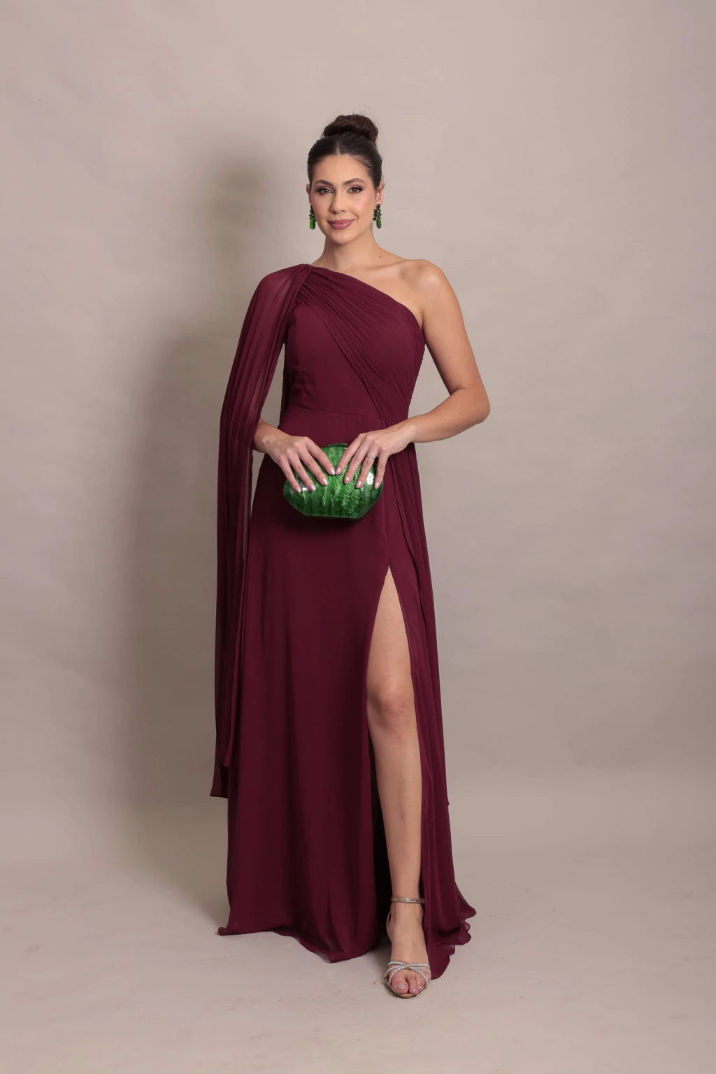 Nosso Vestido Bella possui decote um ombro só com manga estilo capa.