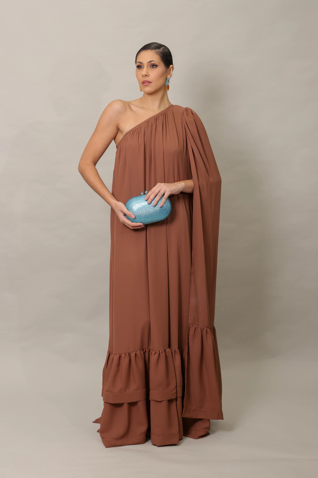 Possui modelagem leve com um ombro só com manga capa lateral.