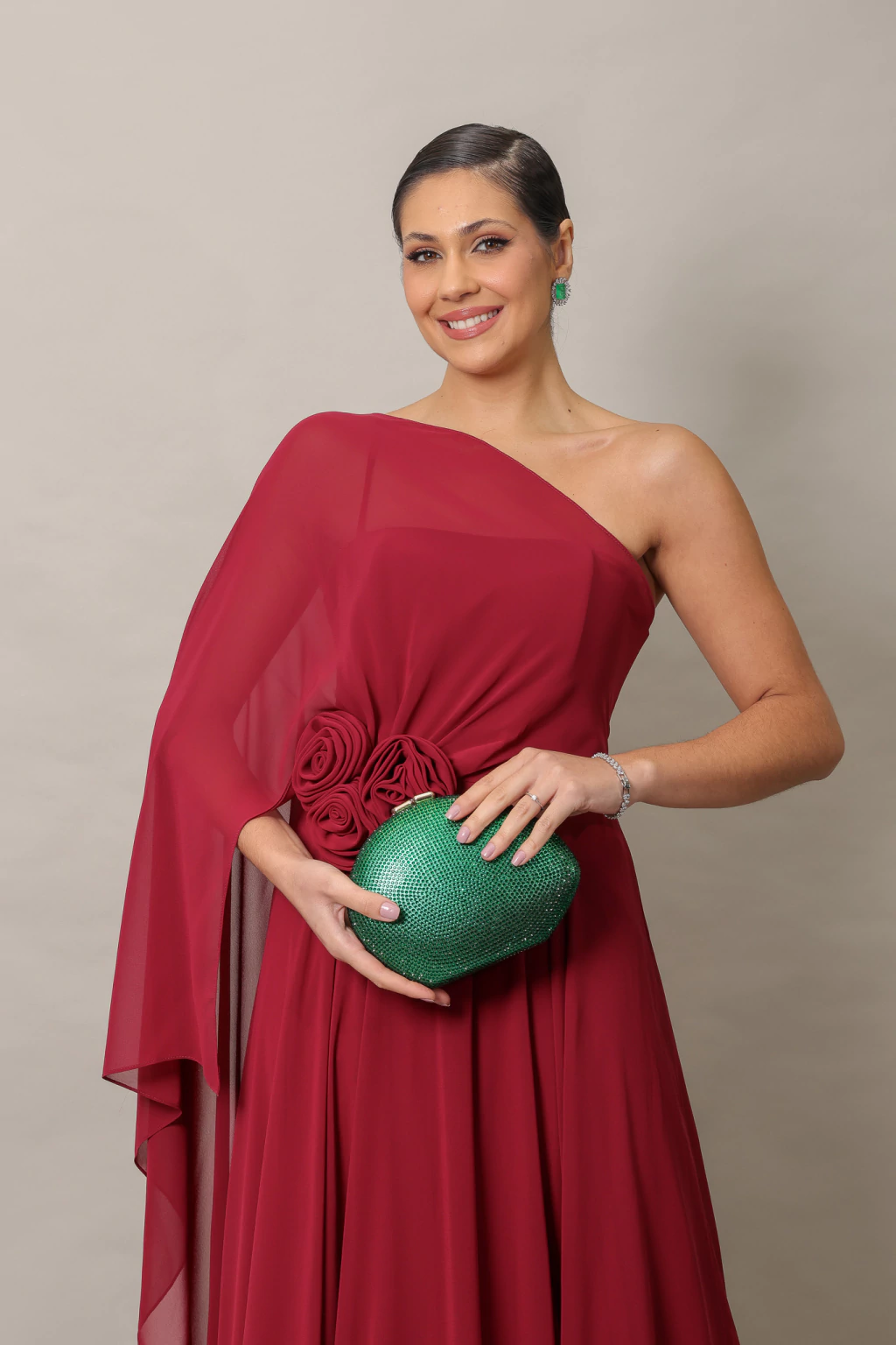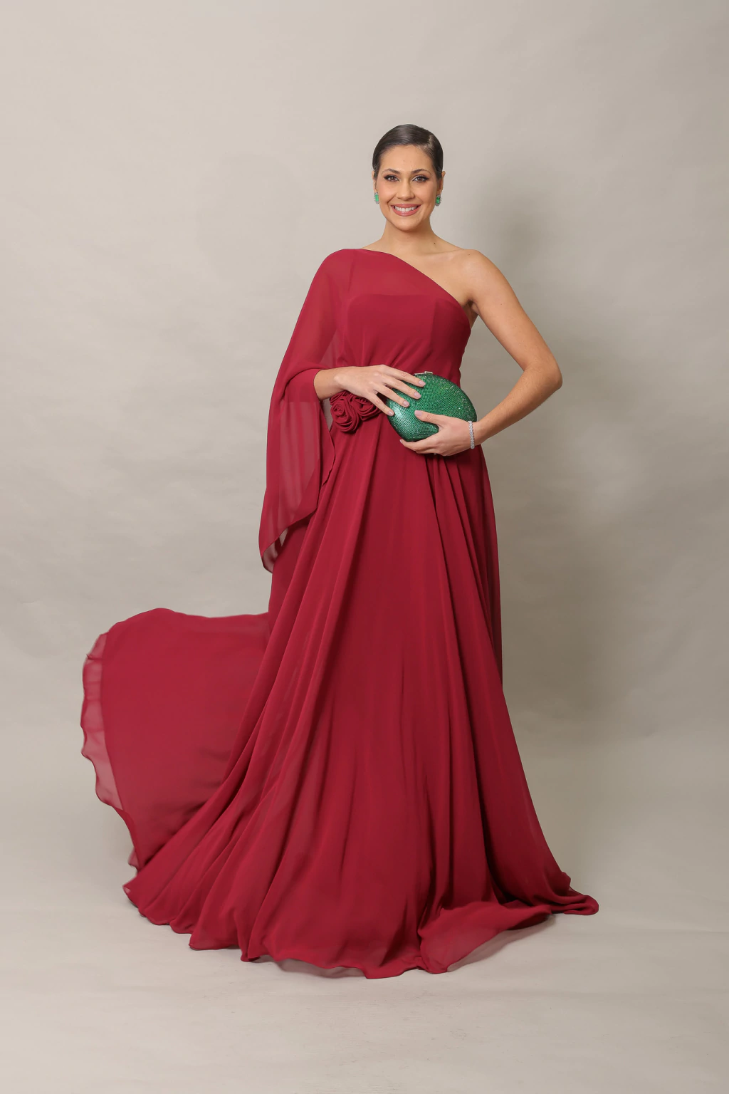 Possui decote ombro só, com manga capa longa e fluida. Possui aplicações de flores 3D na altura da cintura.