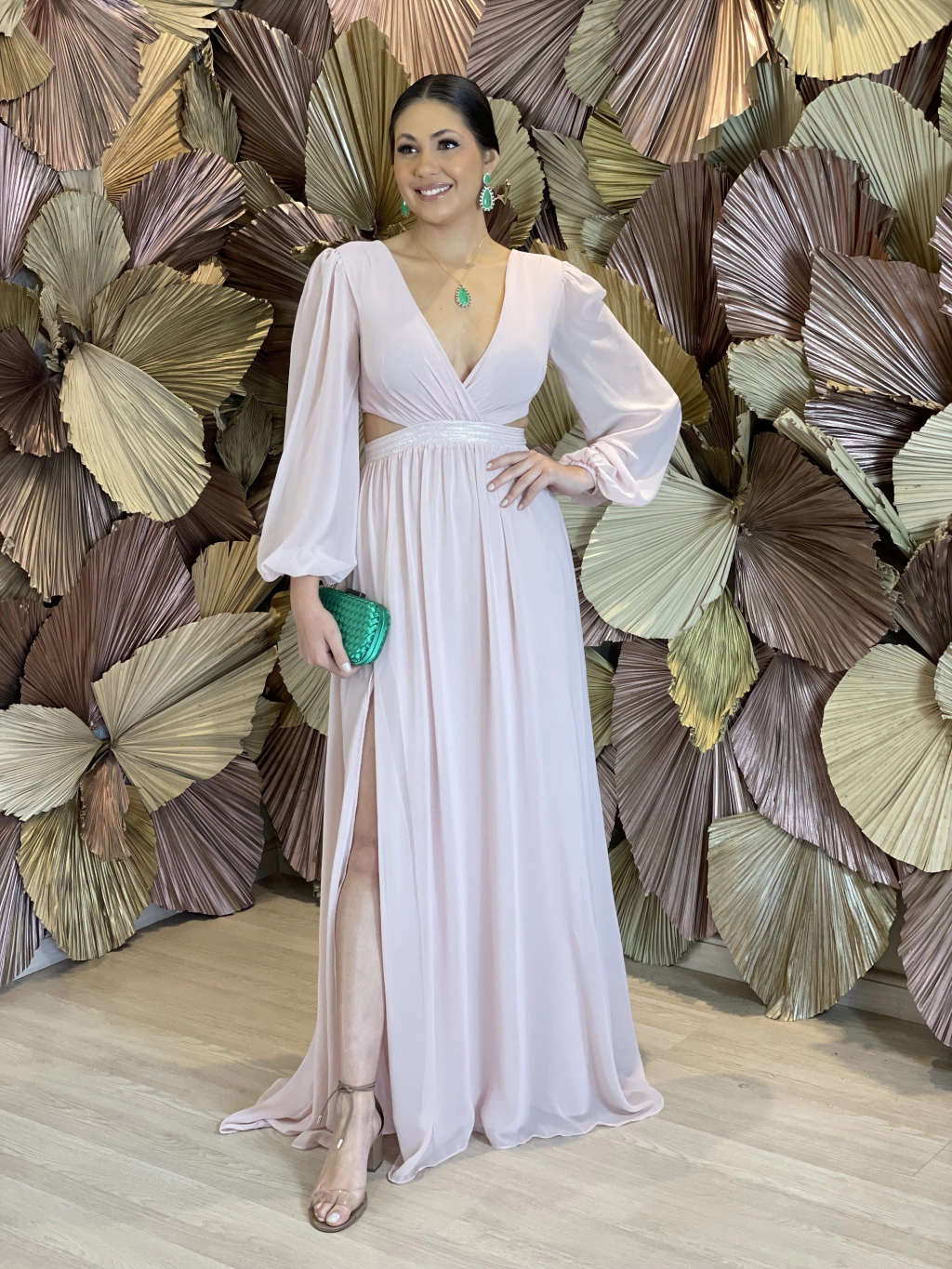 Nosso Vestido Jenny possui mangas longas com recortes laterais e decote pronfundo.